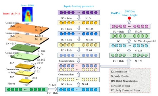 This paper also aims to propose a wave height retrieval method considering the influence of rainfall. In view of the advantages of deep learning in multi-parameter modeling, this article uses the proposed DCNN model architecture for SWH and swell height retrieval, as shown in Figure 4.
