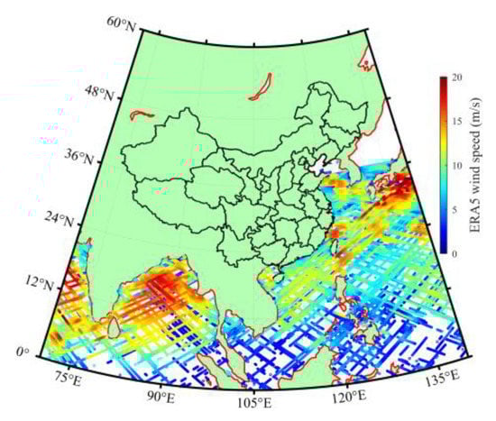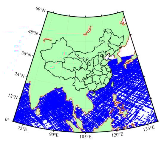 The GNSS-R data of the oceans near China observed by the CYGNSS satellite are selected. Figure 5 shows the trajectory of the GNSS reflection point of the oceans near China observed by the CYGNSS satellite. The red line in the map indicates the coastline, the track of blue point is the track of the GNSS reflection point, the green spot indicates the land, and the area except the green spot is the ocean. This article only studies all oceans from 70° east longitude to 150° east longitude and from 0° north latitude to 60° north latitude, and other oceans outside this range are not covered by this article. The observation data cover the period from 1 April 2019 to 15 June 2021.