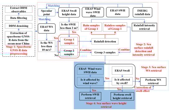 Flow chart of joint retrieval method for sea surface rainfall intensity, wind speed, and wave height based on spaceborne GNSS-R.