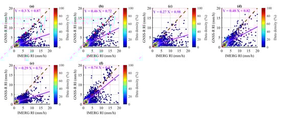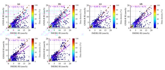 Scatter density plots of inverted rainfall intensity before correction of swell and wind speed effect and after correction of wind speed effect and IMERG-F rainfall intensity. The left panel is the result before the correction of the swell and wind speed effect and the right panel is after the correction of the wind speed effect. (a,b) the wind speed range is 0–10 m/s; (c,d) the wind speed range is 5–10 m/s; (e,f) the wind speed range is 0–5 m/s.