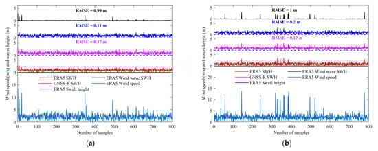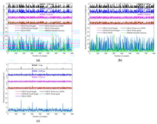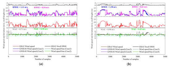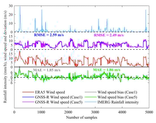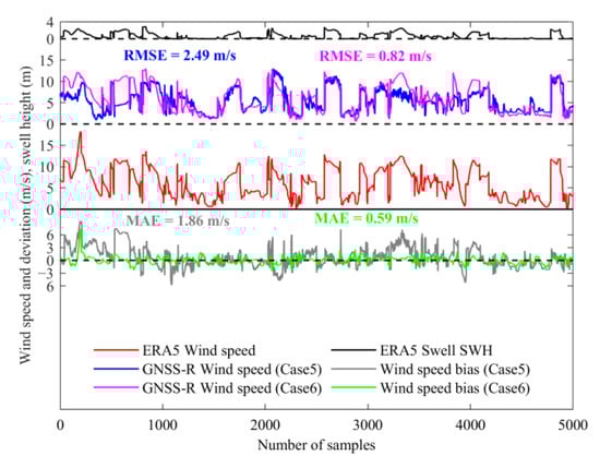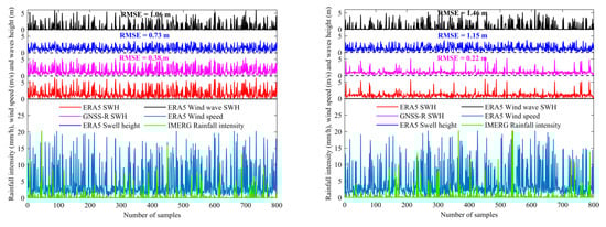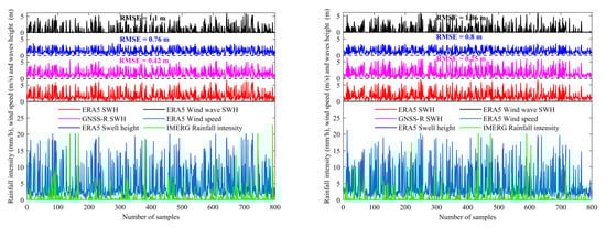 Figure 15 (top) shows the retrieval results of sea surface SWH before and after the influence of rainfall is taken into account for randomly selected partial sample data, corresponding to Case 1 and Case 5, respectively. The figure also shows the RMSE of the retrieved SWH using GNSS-R method and the SWH of ERA5 before and after considering the influence of rainfall (magenta letters), the RMSE of the swell height of ERA5 and the SWH of ERA5 (blue letters), and the RMSE of the wind wave SWH of ERA5 and the SWH of ERA5 (black letters). In addition, for the convenience of analysis, the rainfall intensity and wind speed information are also given in the figure. Note that wind speed is not used as an input parameter of the DCNN model in these two cases. Figure 15 (bottom) shows that when the wind speed is used as the input parameter of the DCNN model, the retrieval results of sea surface SWH before and after considering the influence of rainfall correspond to Case 2 and Case 6 described above. The reason for considering wind speed as an input parameter here is that it is the driving force of the waves, especially at high wind speeds [].