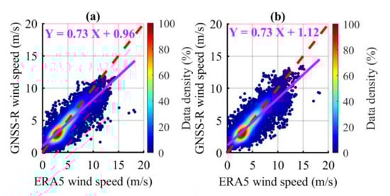 The above analysis shows that the impact of swell on the retrieval accuracy of wind speed is significant, especially for low-speed wind. Although currently there is no effective algorithm that can reasonably eliminate the impact of swells, using a deep learning algorithm, it is possible to build a mathematical model between swell and wind speed and establish a correction model for the error caused by swell, thereby reducing the impact of swell on wind speed retrieval. Figure 14 shows the distribution of retrieved wind speed of spaceborne GNSS-R method before and after eliminating the influence of rainfall, which corresponds to Case 1 and Case 4. Among them, the retrieval results of wind speed of Case 4 have been corrected by surge SWH. It can be seen from the diagram that the retrieval results of wind speed without excluding data affected by rainfall and without SWH correction are very poor, especially under the condition of medium and high wind speed, the retrieved wind speed is very different from ERA5. On the contrary, when the data affected by rainfall is excluded and the swell height is corrected, the distribution of retrieved wind speed is very consistent with the ERA5 wind speed distribution. The feasibility and reliability of the proposed method are further confirmed.