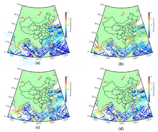 Retrieval wind speed distribution maps before and after eliminating the influence of rainfall and correcting swell influence. (a) Reference wind speed of Case 1. (b) Inverted wind speed in Case 1. (c) Reference wind speed of Case 4. (d) Inverted wind speed in Case 4.