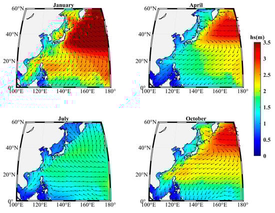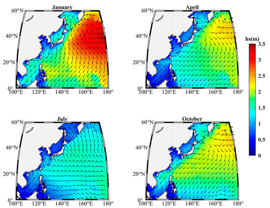 The seasonal patterns of the oceanic state of the NWP are closely linked to the seasonal patterns of monsoons, especially in the 30–60°N region. With respect to these seasonal patterns, we considered four months (January, April, July, and October, by convention) to better comprehend the NWP wave climate. The 20-year (2001–2020) averaged significant height of total waves in each of these months is shown in Figure 1. January (boreal winter) is characterized by the highest wave height in the NWP, with a mean significant wave height of total waves of 2–4 m. April (boreal spring) and October (boreal autumn) constitute transition periods, with broadly low wave heights and similar wave directions, but there are higher wave heights near Taiwan in October due to the tropical cyclone effect. July (boreal summer) has the lowest wave heights, in contrast to the wave climate during the other three seasons. The significant heights of total waves in the South China Sea and the Sea of Japan always remain low compared to the waves in the open ocean. This is due to the presence of islands that block wave propagation from the open ocean. Apart from the effect of the low-pressure systems, the waves all move onshore, especially in China’s offshore waters. Therefore, swells off the coast of China might propagate from the open ocean.
