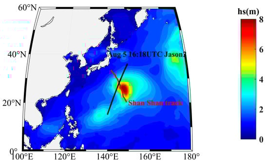 The spatial distribution of the significant height of total waves at 16:00 UTC on August 5 from the ERA5 reanalysis data. The black line indicates the ground tracks of the Jason-2 altimeter at 16:18 UTC on 5 August 2018. The red line is the best track of Shanshan from 0:00 UTC on 4 August to 00:00 UTC on 8 August 2018.