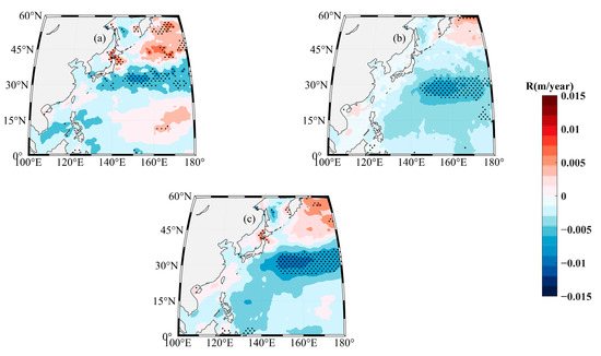 Annual increase rate of EWH: (a) calculated using the significant height of wind seas, (b) calculated using the significant height of swells, and (c) calculated using the significant height of total waves. The regions with statistically significant responses at the 10% level are highlighted.