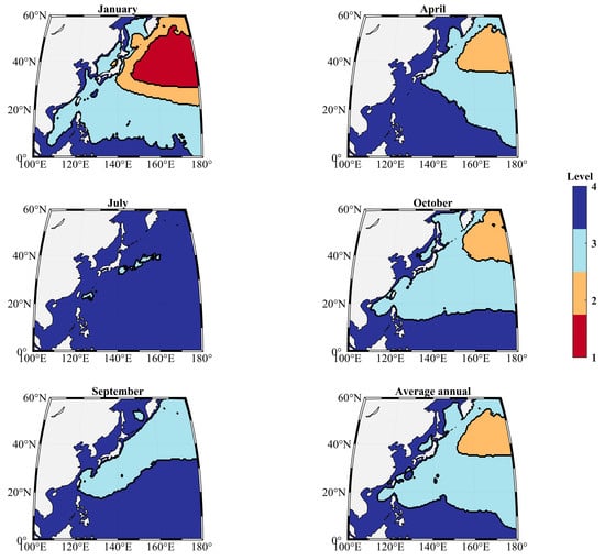 Figure 13 shows the seasonal variation in wave intensity according to Table 1, calculated from the daily maximum wave heights averaged over 20 years. During winter, the NWP experiences higher levels (i.e., levels I and II) throughout most of the area; meanwhile, in summer, the wave intensity is at level III or IV across the entire NWP. The Sea of Okhotsk has level I wave intensity when not covered by sea ice in winter and spring. The wave intensity in the offshore waters of China and low-latitude ocean areas (except in the area around Taiwan Island) experience low levels throughout the year. In particular, the low latitude of the eastern Pacific has been at the lowest wave intensity throughout the period under consideration. In October, a center of level II intensity occurs near Taiwan, due to the effects of tropical cyclones. The 30°N dividing line is visible in April and October; this is the line that demarcates the large-scale low-pressure system. Overall, wave intensity is highest in January (boreal winter) and the level I wave intensity occupies the largest area compared to the other three seasons. Although typhoons are frequent in September, no significant increase in wave intensity occurs due to the average value used in the calculations.