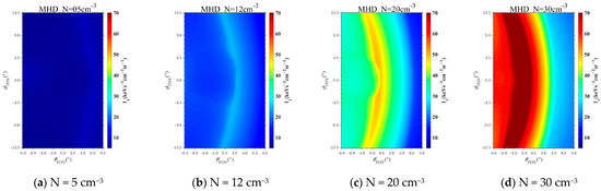 MHD 2D integral diagrams: (a) N = 5 cm−3; (b) N = 12 cm−3; (c) N = 20 cm−3; (d) N = 30 cm−3.