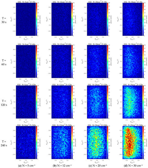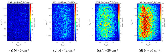 SXI simulation diagram with an integration time of 30 s: (a) N = 5 cm−3; (b) N = 12 cm−3; (c) N = 20 cm−3; (d) N = 30 cm−3.