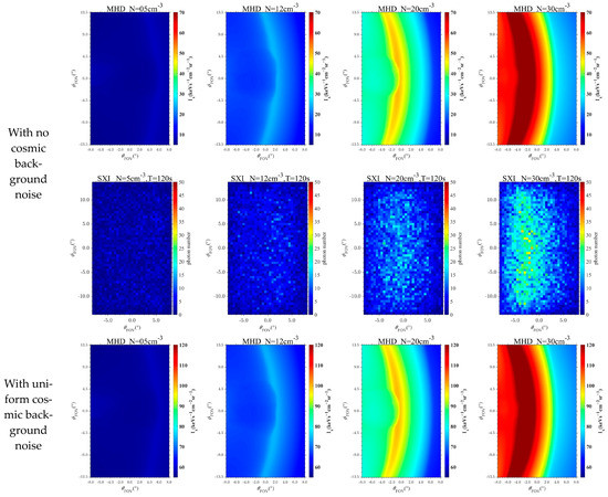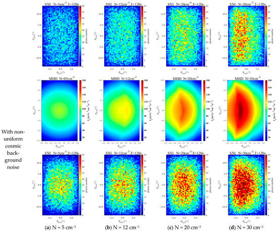 Two sources of noises were considered in the simulated images. One is instrument noise, which is included in the SXI simulation software, and the other is the cosmic background noise. The average cosmic background X-ray intensity was considered to be 50 keVs−1cm−2sr−1 [22]. Ideal uniform cosmic background noise was obtained by adding 50 to the radiation intensity of each pixel of the MHD binary integral map. However, for non-uniform cosmic background noise, owing to the varied changes in the cosmic background X-ray intensity, this paper only studies the cosmic background noise that has a Gaussian shape with an average of 0 keVs−1cm−2sr−1, the highest center position intensity, and the range of decreasing edges. The MHD images and SXI simulation images with uniform cosmic background noise and non-uniform cosmic background noise are superimposed, as shown in Figure 4. The integration time for all SXI simulated images is 120 s, and the solar wind number density is N = 5 cm−3, N = 12 cm−3, N = 20 cm−3, and N = 30 cm−3 from left to right.
