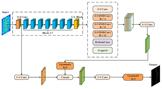 We propose a semantic segmentation network model for the magnetospheric system of soft X-ray images based on DeeplabV3+. The improved content includes the following: the backbone network is replaced by the improved network of MobileNetv2, the CA attention module is introduced [45], and ASPP is changed into a multi-branch feature fusion module, introduces deformable convolution, and changes the dilation rate of Atrous Convolution. The improved network structure is shown in Figure 7.