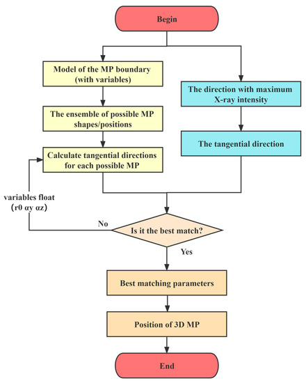 In this study, the tangent fitting approach (TFA) was used to retrieve the 3D magnetopause position from 2D images. The TFA flow is shown in Figure 10. Previous studies have shown that the tangent to the magnetopause is at the maximum X-ray intensity [20] or located between the maximum X-ray intensity gradient and the maximum emissivity, probably closer to the maximum X-ray intensity gradient [23]. New research shows that the maximum soft X-ray intensity gradient tends to be the tangent of the magnetopause’s inner boundary, while the maximum soft X-ray intensity tends to be the tangent of the magnetopause’s outer boundary [46]. This paper assumes that the location of the maximum pixel point of X-ray intensity corresponds to the tangential direction of the magnetopause in order to simplify the calculation.