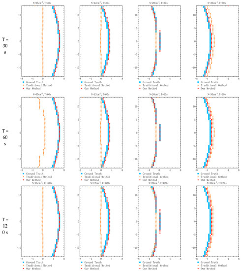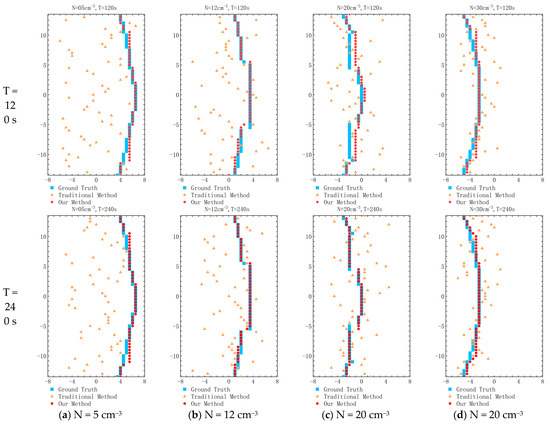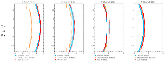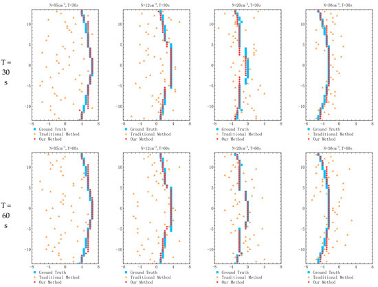 The calculation results for r0 at different integration times and solar wind number densities are listed in Table 2. Figure 15 shows the test data with uniform cosmic background noise. Taking the position error r0 of the magnetopause as the evaluation standard, the magnetopause detection results under different solar wind number densities with integration times of 30 s, 60 s, 120 s, and 240 s are shown. The r0 of the traditional method is greater than 1RE for the data of 30 s, 60 s, 120 s, and 240 s when the solar wind density N = 5 cm−3. The minimum r0 of the test data was 0 and the maximum was 0.2RE.