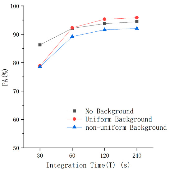 As shown in Figure 13, under the test set with different background noises, PA increased as the integration time increased. When the integration time was 30 s, the network had the best detection efficiency on the test set with no background noise, and the PA reached 86.28%. When the integration time was 60, 120, and 240 s, the network had a slightly higher detection efficiency on the test set with uniform noise than on the test set with no background noise and the test set with non-uniform background noise. This is because the signal strength is low when the integration time is short, the background noise is equivalent to the target signal strength, and the background noise has a significant impact on the detection performance. As the integration time increases, the target signal strength increases and the influence of background noise decreases, so the detection efficiency of the network on the three types of backgrounds is not different.