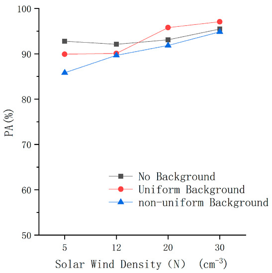 It can be seen from Figure 13 that, for all kinds of background noise test sets, PA increases with an increase in solar wind density. When the solar wind density is 5cm−3, the network had the best detection efficiency on the test set with no background noise, with a PA of 92.8%. When the solar wind density was 20 cm−3 and 30 cm−3, the network had a slightly higher detection efficiency on the test set with uniform noise than on the test set with no background and with nonuniform background noise. This is because solar wind density is proportional to the target signal intensity. When the solar wind particle number density is small, the X-ray radiation rate is not large enough, and the light source that can be detected by the instrument is not strong enough, resulting in the amplification of the impact of cosmic background and instrument noise on the results. With the increase in the number density of solar wind particles and the increase in the X-ray radiation rate, the instrument can detect more light sources and reduce the impact of noise, so the detection efficiency of the network on the three types of background was not different.