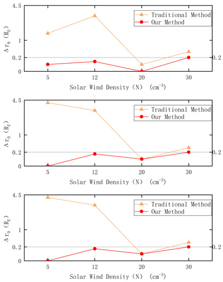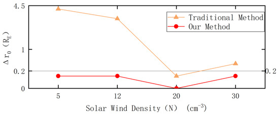 Because the pixel size of SXI is approximately 0.5°, it corresponds to a spatial accuracy of approximately 0.2RE on a spatial scale [22]. The calculation results of TFA in 3.2 show that the traditional method of detecting the position of the magnetopause is closer to the ‘true value’ with the increase in the integration time, but the noise effect is too large when the solar wind density is small, and the increase in the integration time cannot completely compensate for the noise of the film and television. When N = 5 cm−3, Δr0 is always greater than 1. The results of this research method, Δr0, for different integration times and different solar wind density ranges did not exceed the instrument error and met the detection requirements.