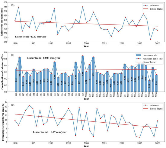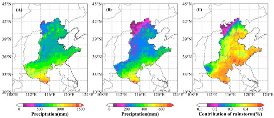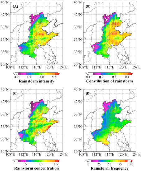 | Contribution of rainstorm | The ratio of the sum of precipitation above the rainstorm threshold to the total amount of precipitation during the same period | dimensionless |