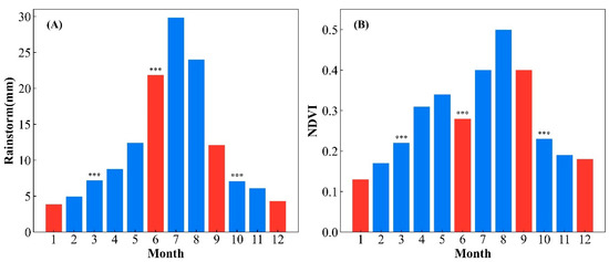 - The spatial distribution of the NDVI at the ten-day scale exhibits a gradually increasing trend from northwest to southeast, consistent with the pattern of extreme hourly precipitation. For extreme hourly precipitation, there is no significant change observed at the multi-year ten-day scale. The NDVI in the northern and central parts of the H-Plain shows a significant decreasing trend; in contrast, it presents a significant increasing trend in the southern region. Moreover, the correlation between extreme hourly rainfall and NDVI at the ten-day scale demonstrates distinct regional differentiation (almost all correlation coefficients pass the significance test), decreasing gradually from north to south. The lagged correlation analysis of extreme hourly precipitation and NDVI for one, two, and three ten-day periods shows that the lagged effect of extreme hourly precipitation on the NDVI is negligible. The correlation analysis of extreme hourly rainfall and NDVI for different months shows that extreme hourly precipitation negatively impacts NDVI.