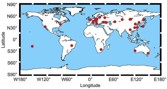 With an increasing number of satellites tracked by ILRS, tracking new GNSS satellites such as BDS is becoming more challenging for laser stations. To cope with the growing demand for observations, SLR stations are constantly optimizing their tracking strategies. Currently, SLR stations can track more than 140 different satellites by adjusting their tracking strategies [21]. Moreover, the number of available SLR stations has been increasing annually along with the development of ILRS [22]. As of August 2022, 34 stations can receive the return laser from BDS satellites, the distribution of which can be seen in Figure 1. Additionally, Table 2 lists their monument code, detector type, location name, and country.