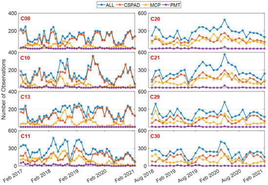 Monthly statistics of SLR observations. ILRS has been tracking BDS-2 satellites since before 2017 (C08, C10, C11, and C13), while the SLR observations of BDS-3 MEO satellites began in August 2018 (C20 C21, C29, and C30).
