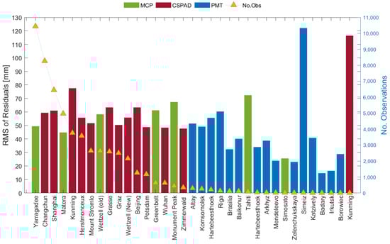 In consideration of the different systematic errors of three groups of stations, Figure 3 shows the number of observations and the RMS of the SLR residuals of the 34 stations listed in Table 2. Unlike other GNSSs, CSPAD and MCP stations provide more than 90% of the SLR observations for BDS, whereas a percentage of the observations are only tracked by PMT stations. This can be explained by the observation priority of SLR stations, while PMT stations concentrated in Russia and nearby countries mainly track GLONASS satellites. The number of SLR observations for MEO satellites is approximately the same for both CSPAD and MCP stations. However, for BDS-2 IGSO satellites, the number of CSPAD observations is three times greater than that of MCP observations. Several CSPAD stations located in China, e.g., Changchun and Shanghai, provide about half of CSPAD observations. The RMS of the SLR residuals from most CSPAD and MCP stations are similar and vary from 50 to 70 mm. The RMS of the residuals from four PMT stations i.e., Altay, Komsomolsk, Hartebeesthoek, and Riga, reached the same level as CSPAD and MCP stations, while the RMS of the residuals from some other PMT stations had a value lower than 40 mm. Despite having a smaller RMS value, the PMT stations with this characteristic had a limited number of SLR observations. As a result, the overall SLR residuals for these stations exceeded 80 mm in RMS.