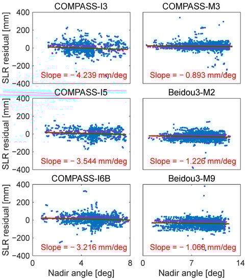 In order to compare the systematic error between multi-photon and single-photon stations, we selected Shanghai, which is equipped with a single-photon detector, to compare it to Yarragadee. Figure 5 shows the variation in the SLR residuals with regard to the nadir angle observed by Shanghai. The slope with regard to the nadir angle was −1.73, −0.95, −0.99, −0.76, −80, and −0.68 mm/deg for COMPASS-I3, COMPASS-I5, COMPASS-I6B, COMPASS-M3, Beidou3-M2, and Beidou3-M9. We found that the slopes of Yarragadee with regard to the nadir angle were larger than those of Shanghai. This suggests that the signature effect exists in the SLR residuals observed by multi-photon stations. In low-energy mode, single-photon stations are not subject to the issues of varying nadir angles since the probability of photon reflection is equal for every corner cube. However, it can be seen that the SLR residuals are also dependent on the nadir angle, which may be attributed to the requirement for post-processing rejection of high-rate data and changes in the optical path of the laser pulse as it passes through the troposphere during observations at different elevation angles [17].
