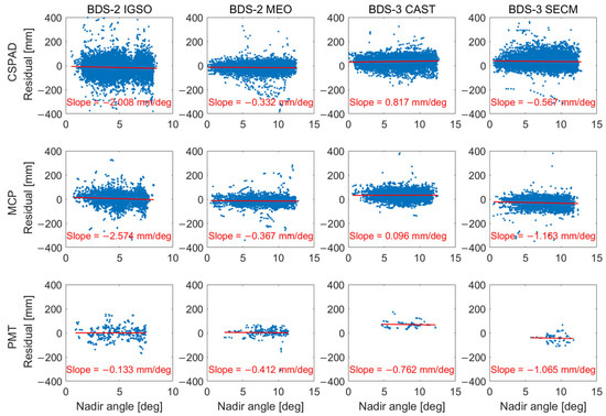 According to the installation method of LRAs, the nadir angle of SLR stations with respect to a satellite reference frame is equivalent to the incident angle of the laser beam on BDS satellites. To investigate the signature effect of multi-photon stations tracking BDS satellites, Figure 4 shows the variation in SLR residuals with respect to the nadir angle observed by Yarragadee. As a high-energy station, Yarragadee provides the majority of observations among the MCP and PMT stations, serving as a representative for multi-photon stations. The slope of COMPASS-I3, COMPASS-I5, COMPASS-I6B, COMPASS-M3, Beidou3-M2, and Beidou3-M9 with respect to the nadir angle was −4.24, −3.54, −3.21, −0.89, −1.23, and −1.07 mm/deg, respectively. The observed SLR residuals demonstrate a clear dependence on the nadir angle, caused by the laser pulses reflected from the nearer cube of the LRAs and a shorter collection time by the detectors. This explains why the slopes are negative values. Moreover, the slopes of IGSO satellites were larger than those of MEO satellites, which is attributed to the larger LRAs and the greater number of corner cubes deployed on IGSO satellites.