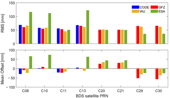 RMS and mean offset of SLR residuals of long-termed tracked BDS satellites (eight satellites except C01 in Table 1) observed by high-performing stations for four ACs.