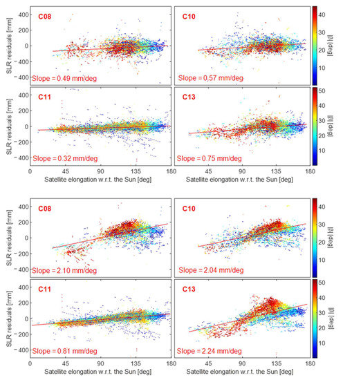 SLR residuals as a function of the elongation angle and the sun elevation for four BDS-2 satellites (C08, C10, C11 and C13): (top): WU; (bottom): ESA.