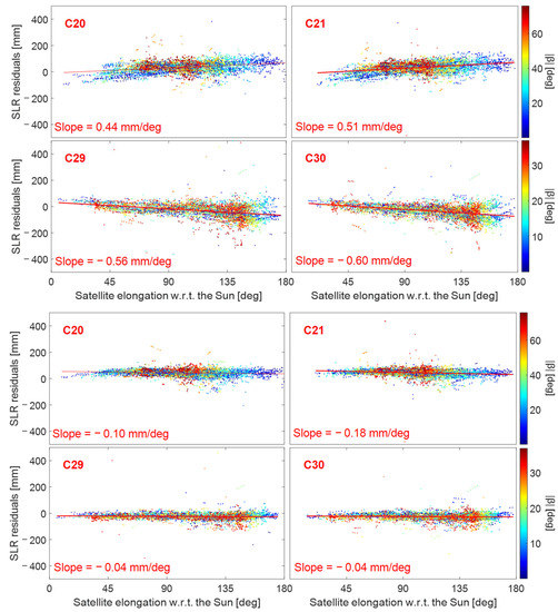 As shown in Figure 8 and Figure 9, out of the three types of MEO satellites, only the slope of the SECM satellites (i.e., C29 and C30) was negative except for the ESA center, whereas the slopes of the other two types of satellites are positive. For BDS-3 SECM satellites, surface X has an area of 1.3 m2, while surface Z has a larger area of 2.6 m2. On the contrary, the X surface area of BDS-2 MEO and BDS-3 CAST satellites is larger than the area of the Z surface, with values of 3.8 and 3.4 m2, and 2.9 and 2.2 m2, respectively [38]. Compared with previous research, it was found that the slopes of SECM and Galileo (X area: 1.3 m2, Z area: 3.0 m2) satellites are negative [17], whereas the slopes of BDS-2 MEO, CAST, and GLONASS (X area: 4.2 m2, Z area: 1.7 m2) satellites are positive [39]. Thus, this phenomenon can be explained by the different shapes of satellites.