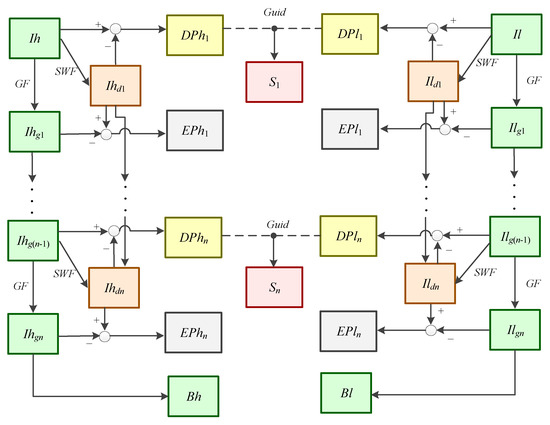 where represents the i-th strengthening layer. represents the i-th detailed layer of MLSW, represents the i-th detailed layer of the MLSW-GS, and i = 1, 2, 3, …. represents the guided filter [38]. contains complex information, and contains little information. Through this guidance operation, we can relatively enhance the weak details in the low-complexity image layers.