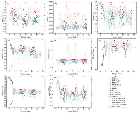 To further demonstrate the applicability of our method, we used four fusion metrics to evaluate the fusion performance: MI, NCIE, , and . The metric values of different fusion methods in different scenes are shown in Table 6, where the best values have been bolded.