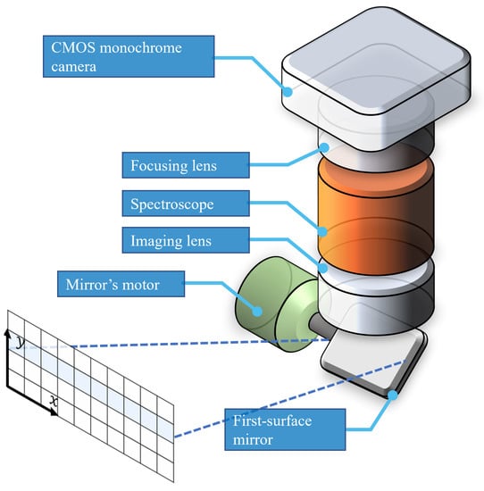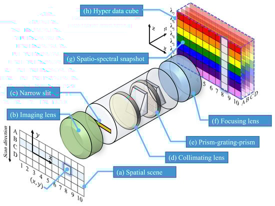 Since the x axis of the scene is directly mapped onto the sensor’s array in each 2D spatio-spectral snapshot , the resulting x axis resolution is the same as the number of effective pixels of the sensor’s , as indicated in Figure 2. Accordingly, it is important to design the spectrograph slit such that its projection can occupy the maximal extent of the CMOS/CCD sensor. For the proposed platform, based on consumer components, there is certainly a compromise in this regard, as consumer spectrometers are not specifically designed to be used in hyperspectral imaging. Accordingly, a careful selection of the focal length of the focusing lens (Figure 1 (f)) will improve the x axis resolution.