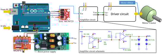 To keep the design simple and with a fast design-implement cycle, we rely on typical desktop computer (PC) to perform most of the functionalities (indicated in Figure 3) including: pre-processing, storage, user interface, and high-level controlling. Accordingly, the required electronics hardware is primarily used to translate the PC commands to a deflection of the mirror angle. The interface is performed through a standard emulated serial port over USB using the popular (and very low cost) Arduino Uno development board. The board is in turn connected to a digital-to-analog converter (DAC) which has a high resolution of 12-bits, and the interface between the Arduino and the DAC is through the standard IC protocol. To further cut the development time, we utilize the popular MATLAB environment which has built-in functions for sending IC commands. As such, the desired value of the DAC can be directly issued by a MATLAB script without the need to develop a custom firmware for the Arduino. The selected DAC is MCP4725, which is widely available and has a full rail-to-rail 0 to 5 V range; however, typical galvo controllers on the market accept a different input range from −5 V to +5 V. Accordingly, the only needed circuitry to be developed is a simple amplifier that converts the 0–5 V signal into −/+5 V, which is shown in Figure 6 along with the simplified schematic diagram of the controller.