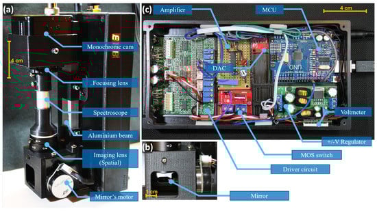 The main optical and mechanical components used in the platform are shown in Figure 4 where we utilize the widely available galvanometer mirror scanners that are commonly used in laser show devices (also called galvo mirrors). These are typically highly capable devices with a fine angular resolution down to a range of a few and with a response rate in the range of multiple kHz [27]. In order to attain precise control, the motor is integrated with a high-accuracy positioning sensor providing the needed feedback for closed loop control, which is performed by the low-level controller (see Figure 3 for details). Consumer-level galvo mirrors are typically sold with an analog driver circuitry that accepts a −/+ 5 V control signal to position the mirror, where the angular deflection is linearly proportional to the input voltage. The closed loop controller is typically sold as part of the low-cost galvo mirrors setup and there is no need to develop it from scratch. Note that, in such laser scanning applications, there are typically two cascaded mirrors; one to perform the x axis scanning and another to perform the y axis scanning. In our application, we just need to move across the y axis; consequently, the x motor is removed. After the mirror, the scene passes through an imaging lens which has the task of creating a real image of the target focused right on the slit. We select the widely available CS-mount camera lens with an adjustable focus and focal lens (2.8–11 mm), these lenses are commonly used for CCTV applications. As such, a small longitudinal portion of the projected image passes through the slit, where the latter comes integrated with the spectrograph optics. In this platform, we utilize a gemstone spectroscope which is basically a simple transmission spectrograph and is widely available for consumers; this spectrograph is sold as a low-cost gemstone identification tool. This spectrograph is designed to produce a virtual image which is originally intended to be directly used by a human operator. Accordingly, in order to obtain a real image projection on the CMOS sensor, we need another focusing lens which we select as a very-low-price M12 lens (which has a 12 mm diameter thread commonly used in low-end USB cameras). The lens aperture fits well with the ocular side of the spectroscope. For the sensor, we choose the widely available Si-based CMOS sensors, and in particular, a monochrome USB camera would be better suited to the imaging requirements than RGB cameras because the latter implement different interpolation methods in the readout circuitry, complicating the amplitude calibration of the spectrum. Other combinations of the optical system are indeed possible; however, care must be taken to maximize the projection on the CMOS sensor and to minimize the chromatic aberration which constitutes the main limitation in such low-cost platforms.