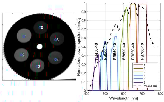 There are different methods to present the 3D data cube in a meaningful manner; one simple method is to plot the overall 2D estimated intensity in (9) along with a 1D power spectral density at a selected point(s), i.e., , where is the given point and z represents the wavelength variable. For this visualization, we image a high-end optical filter wheel from Thorlabs Inc. equipped with six bandpass optical filters at consecutive center wavelengths. Namely, each filter has a bandwidth of 40 nm (full width at half maximum—FWHM) and the centers are 50 nm apart. As shown in Figure 10, the spectrum of six sampling points is superimposed where each spectrum is observed to be confine to the bandwidth of the corresponding optical filter. The overall illuminating spectrum is overlaid as a dotted line.