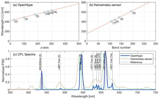 For mapping the optical spectrum to the CMOS sensor’s z axis, we need to capture a series of known wavelengths . One cost-effective method is to use common florescent lamps which, unlike LEDs and incandescent sources, have sharp spectral peaks in the visible band. The emitted spectrum of a typical florescent lamp is a complex combination of mercury (Hg) vapor emission and the phosphorescent emission of the tube coating. This coating is a blend of rare earth phosphors including yttrium (Y), europium (Eu), and terbium (Tb) with different proportions aiming to provide convenient color rendering for lighting applications [31]. As such, by using a simple fluorescent tube or the more recent compact fluorescent lamp (CFL), we can note multiple spectral peaks that can be easily identified, some of which are known emission lines of Hg [32], whilst the rest are from the rare-earth-doped phosphors. Therefore, in order to perform the spectral mapping, we illuminate a bright subject with a typical CFL lamp and compare the resulting pattern to publicly available spectral measurements performed by a high-end spectrometer Ocean Optics HR2000 [33]. We depict the results in Figure 13a showing the peak mapping between the sensors z axis and the peak’s wavelength where the linearity of the utilized spectroscope is evident. To establish a comparison with other commercial devices, we utilize the mid-range compact spectrometer-Hamamatsu C12666MA which operates in the visible band. As can be seen in Figure 13c, the proposed platform outperforms this sensor and provides a much better match and resolution when compared to higher-end spectrometers. For additional comparison, note that a typical high-end commercial spectrometer has a spectral accuracy of 0.1–10 nm [34].