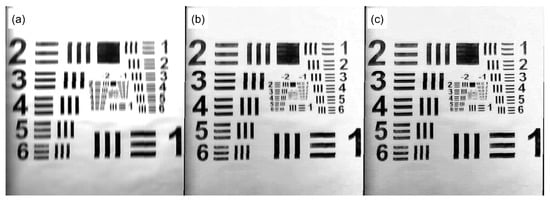 In Section 2.1.2 and Section 2.1.3, we provide the theoretical basis for calculating the resolution in terms of the number of CMOS pixels. However, for a practical quantitative comparison, we utilize a version of the widely used test chart, 1951 USAF, as the target scene illuminated with a CFL light source. The collected scene by the OpenHype platform is presented in Figure 14, where Figure 14a shows the estimated intensity image obtained based on the formula in (2) where, by comparing with the monochromatic intensity , we note an improved resolution of the latter due to the lack of chromatic aberration. The final Figure 14c shows an improved monochromatic intensity after applying the presented deconvolution method in Section 2.1.4.