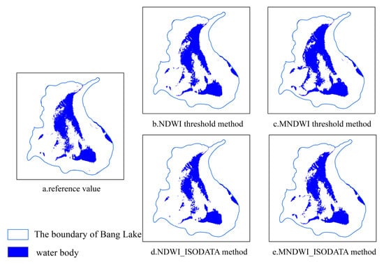 In order to ensure the applicability of the water surface extraction method, the Bang Lake was selected as the verification area. In the available months of Landsat 8, one of the construction results (20 November 2015) was selected and compared with the extraction results of the NDWI threshold method, MNDWI threshold method [], and MNDWI_ISODATA. The method used in this study to determine the threshold was Otsu [,]; it is considered the best algorithm for threshold selection in image segmentation. It is simple to calculate and is not affected by image brightness and contrast, so it has been widely used in digital image processing. The reference value is the extraction result of the GF-1 image using the ISODATA, and the image date is adjacent. The comparison results are shown in Figure 3.
