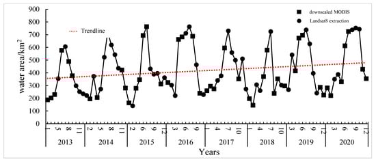 Finally, limited by the launch time of Landsat 8 satellite, the water area was extracted after 2013 []. To acquire the information from before 2013, other data from the previous satellite sensors (e.g., Landsat 5) can be introduced to our model in the future study []. Considering multi-source remote sensing satellites, our downscaling method can be used in higher-resolution remote sensing imagery (such as sentinel-2) for months when optical images are unavailable.