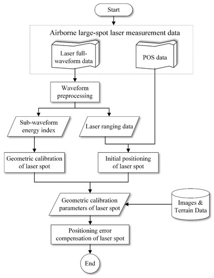 The geometric parameters of the laser spot are calibrated by using the characteristics of the laser echo waveforms of a specific terrain without ground calibration equipment. Firstly, the ground position of the laser spot is determined by the laser positioning model, and then the energy distribution of the footprint spot is inverted by combining the energy indexes of the full waveform data, from which the geometric calibration parameters of the laser spot can be obtained. The technical process of the method is shown in Figure 2.