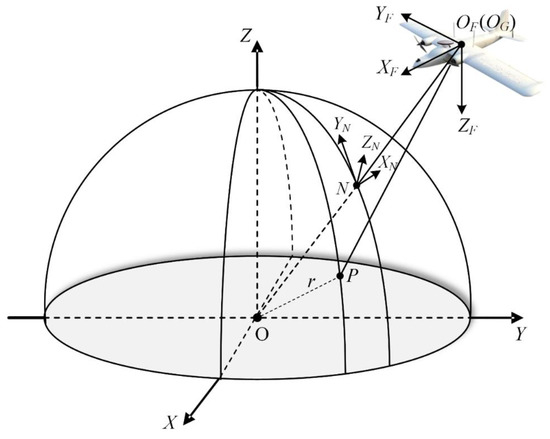 The geometric positioning model of the airborne large-footprint laser spot is constructed according to the basic principle of laser altimetry. As shown in Figure 3, the reference datum of the measurement is determined first. Here, the Earth’s centroid position point O is the origin of the reference coordinate system, and the geocentric coordinate system O–XYZ is the WGS84 coordinate system. The airborne platform coordinate system OF–XFYFZF is defined as follows: the origin OF is the geometric reference point of the airborne platform; the coordinate axis XF points to the flight direction of the aircraft; the coordinate axis ZF is located in the plane of the track and perpendicular to the XF axis, which points to the ground; the coordinate axis YF is perpendicular to the plane of the track, and the pointing follows the right-hand rule. To construct the geometric relationship between the airborne platform and the reference datum, the navigation coordinate system N–XNYNZN is defined as follows: taking the point N under the aircraft as the origin, the coordinate axis XN is perpendicular to the coil and points to the east; the coordinate axis YN is perpendicular to the normal direction and points to the north; and the coordinate axis ZN points to the zenith. The aircraft POS can record the position and attitude information of the airborne platform in real time. The point OG in Figure 3 is the corrected GPS antenna center position, which overlaps with the geometric reference point OF of the airborne platform by default. The attitude information of the platform records the angle change between the platform coordinate system and the navigation coordinate system.