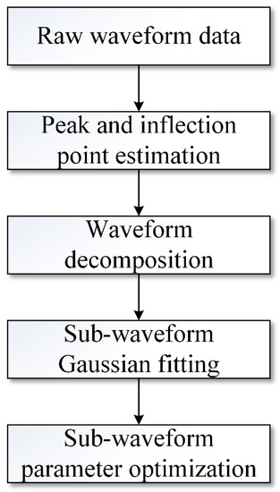 The flow of laser waveform preprocessing is shown in Figure 6. The position of the inflection points and peaks are firstly estimated by the characteristic points of the waveform, and the waveform containing multiple peaks is decomposed. Then, the Gaussian fitting of the sub-waveform is performed, using the least squares method to further refine the laser sub-waveform characteristic parameters, which are used to solve the metric parameters involving the energy index of the waveform.