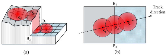 The spacing between adjacent laser spot centers is known to be d, and the angle between the along-track direction and the step surface boundary line B1B2 is . Then, the energy distribution of the laser spot can be expressed as Formula (6):