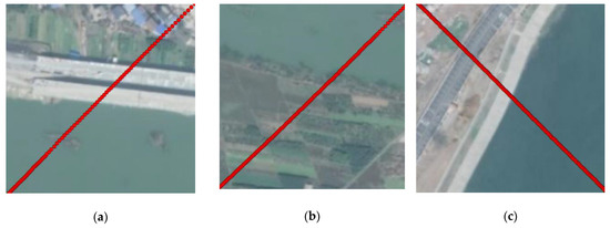 Flat terrain areas are selected for the validation experiments to ensure that at least one laser beam can completely irradiate the flat surface and that there is a step change in the elevation of the surface in the along-track direction. A total of six flat terrain areas were selected as experimental areas, and the types of surface objects were mainly river shorelines and road edges, as shown in Figure 10.