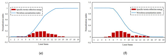 Combining the position of laser footprint spots on the ground and waveform characteristics, the echo waveforms are decomposed, and their energy indexes for the specific terrains are extracted. Because the reflectivity of the laser beam irradiated to the ground surface is different in different experimental areas, we normalized the energy index of laser waveforms in each area in order to ensure the consistency of the echo waveform energy index in the six experimental areas. The results are shown in Figure 12.