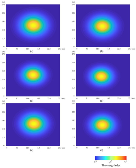 The calibration process in this study does not depend on a calibration field but the determination of the spot energy distribution boundary by using the reflected energy of the laser beam on the ground. There are some differences between the two methods of measuring the divergence angle of the laser beam. The reflected signal through the laser spot will inevitably lead to a sharp reduction in energy, and the definition of the spot edge is still calculated according to the 1/e2 of the energy distribution as the basis for the solution, so the calculated divergence angle of the laser beam is slightly smaller than the design parameter. In this regard, the consistency of the spot energy distribution in each of the six experimental areas is evaluated compared to the laser spot image collected in the laboratory, as shown in Table 5.