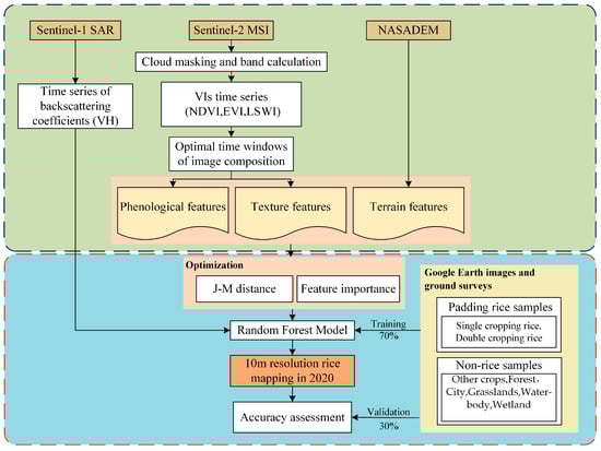 In this study, we use a random forest (RF) approach to map rice. Specifically, Sentinel-1/2 time series features and training samples are used to train RF classification models to distinguish rice from others. RF is a machine learning algorithm proposed by Breiman in 2001 [71]. It is a self-learning, integrated machine-learning algorithm based on decision trees, using the bootstrap resampling method to construct decision trees by randomly selecting samples from the training sample set, and combining the prediction results of all decision trees to vote for the final result. The random forest algorithm is a common technical tool for remote sensing mapping of crops because of its fast computing speed, robust model, and strong generalization ability. To balance the prediction accuracy and computation time of the random forest model, the number of Trees was set to 100 in this study, and other parameters were kept as the default settings in GEE.