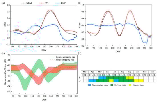 (a,b) Spectral-temporal feature curves profiles over different crop types; (c) The time series curves of backscattering coefficient for VH for double cropping rice, single cropping rice; (d) Rice cropping phenological calendar of Hunan province, where S stands for single-cropping rice and D stands for double-cropping rice.