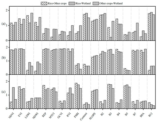 In this study, primitive feature sets (consisting of 12 primitive band features, 13 spectral features, 6 texture features, and 4 topographic features) for different phenological periods were constructed to improve the interclass differentiation among rice, other crops, and wetlands, and the JM distance for screening the best combination of features to meet the differentiability requirements. Figure 5 describes the separability statistics of features between rice and other crops, rice and wetlands, and other crops and wetlands. The first two features with a JM distance greater than one among them, during transplanting, were B12 (1.72–1.87) and LSWI (1.172–1.82), respectively. Owing to the fact that the field is filled with water during transplanting, the surface humidity increases, and both LSWI and B12 bands are sensitive to soil moisture changes. It is worth noting that for rice and other crops, this period is the best time to distinguish them from each other. The highest J m values obtained during the growth period were for two vegetation characteristics, REP and GCVI. In the southern region, the rice growing season is mostly accompanied by the arrival of the rainy season. In particular, for the period from April to mid-September 2020 strong precipitation events were frequent in the area north of central Hunan Province. The distinguishability between rice and wetlands was greatest at this stage, which was attributed to the enhanced surface-water signal in wetlands during this period, while rice showed a strong vegetation greenness signal. In summary, the selected taxonomic characteristics of rice at each stage are shown in Table 4.